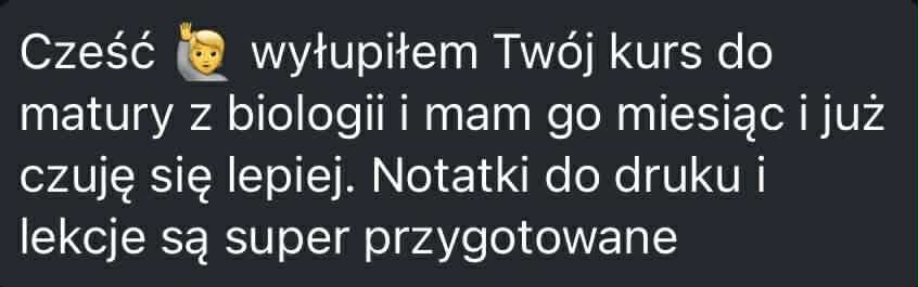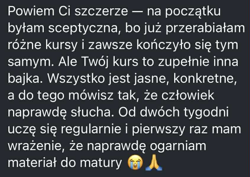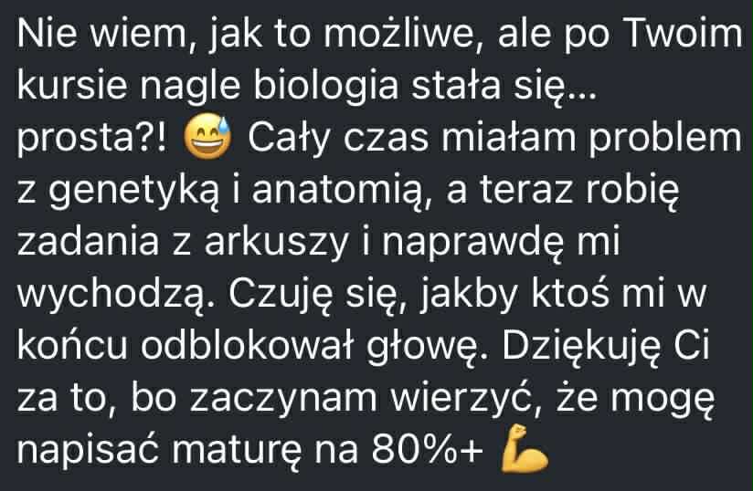Absolutnie! Ten kurs to nie tylko sucha wiedza, to strategia na świetny wynik. Skupiamy się na schematach zadań CKE, byś wiedział, jak pisać odpowiedzi, a nie tylko co pisać. Nasi kursanci osiągają wyniki 90%+, realizując swoje marzenia np. o studiach medycznych. To inwestycja w Twoją przyszłość! Przestań się wahać, zacznij uczyć się skutecznie już dziś!
