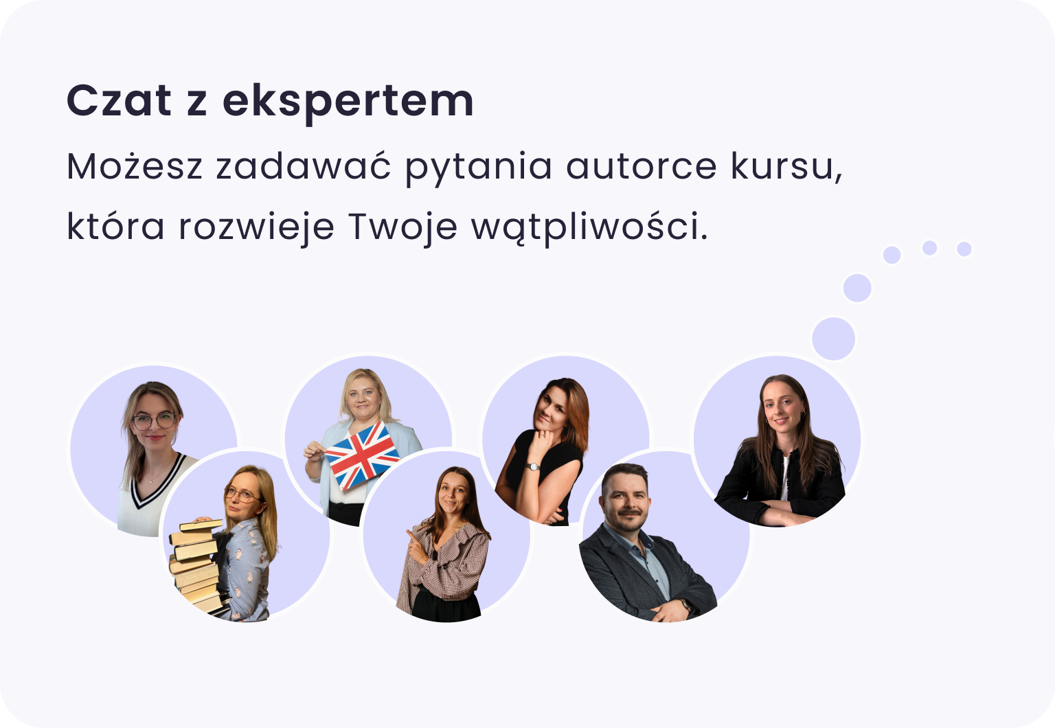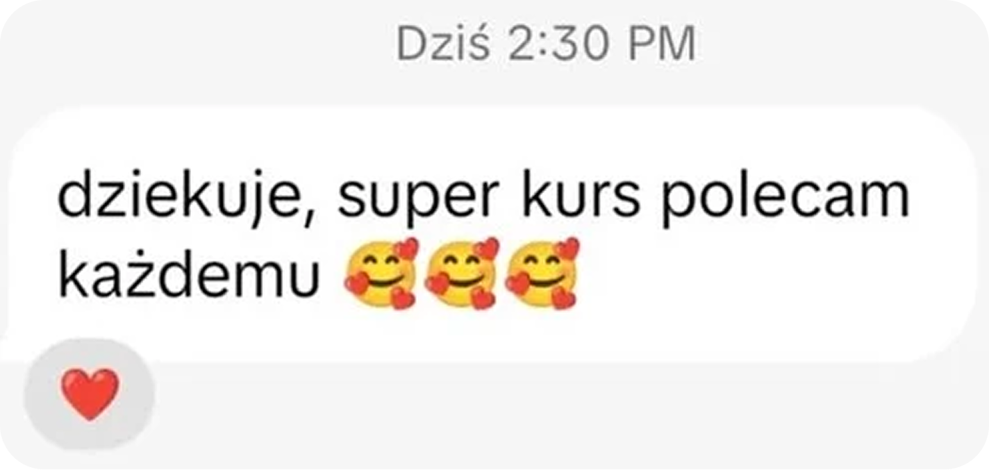 W naszym systemie nikt nie zostaje z problemem sam. To właśnie tutaj deklasujemy tradycyjne korepetycje, gdzie na pomoc nauczyciela często trzeba czekać cały tydzień do kolejnego spotkania. U nas otrzymujesz potrójny system wsparcia, który działa natychmiast: Codzienny kontakt z nauczycielką: To nasz priorytet. Masz stały kontakt z autorką kursu, która na bieżąco rozwiewa wszelkie wątpliwości. Nie trzeba czekać na lekcję – wysyłasz pytanie i otrzymujesz konkretną odpowiedź, która pozwala ruszyć dalej z materiałem. Asystent Nauczania AI (dostępny 24/7): Nauka późno wieczorem lub w weekend? Nasz inteligentny asystent jest dostępny przez całą dobę. Wytłumaczy każde zagadnienie lub naprowadzi na rozwiązanie zadania w kilka sekund, nawet w środku nocy. Społeczność kursantów: Dołączasz do zamkniętej grupy ambitnych uczniów, gdzie wspólnie się motywujecie i pomagacie sobie nawzajem. To idealne miejsce, by poczuć, że nauka może być wspólną przygodą, a nie przykrym obowiązkiem.