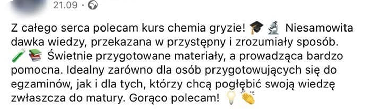 Stworzyłam moje kursy, bo wiem, że w szkole chemia jest niezrozumiała, a moim celem jest to zmienić. Pokażę Ci, że to logiczny system, a nie zbiór wzorów i definicji do wykucia.