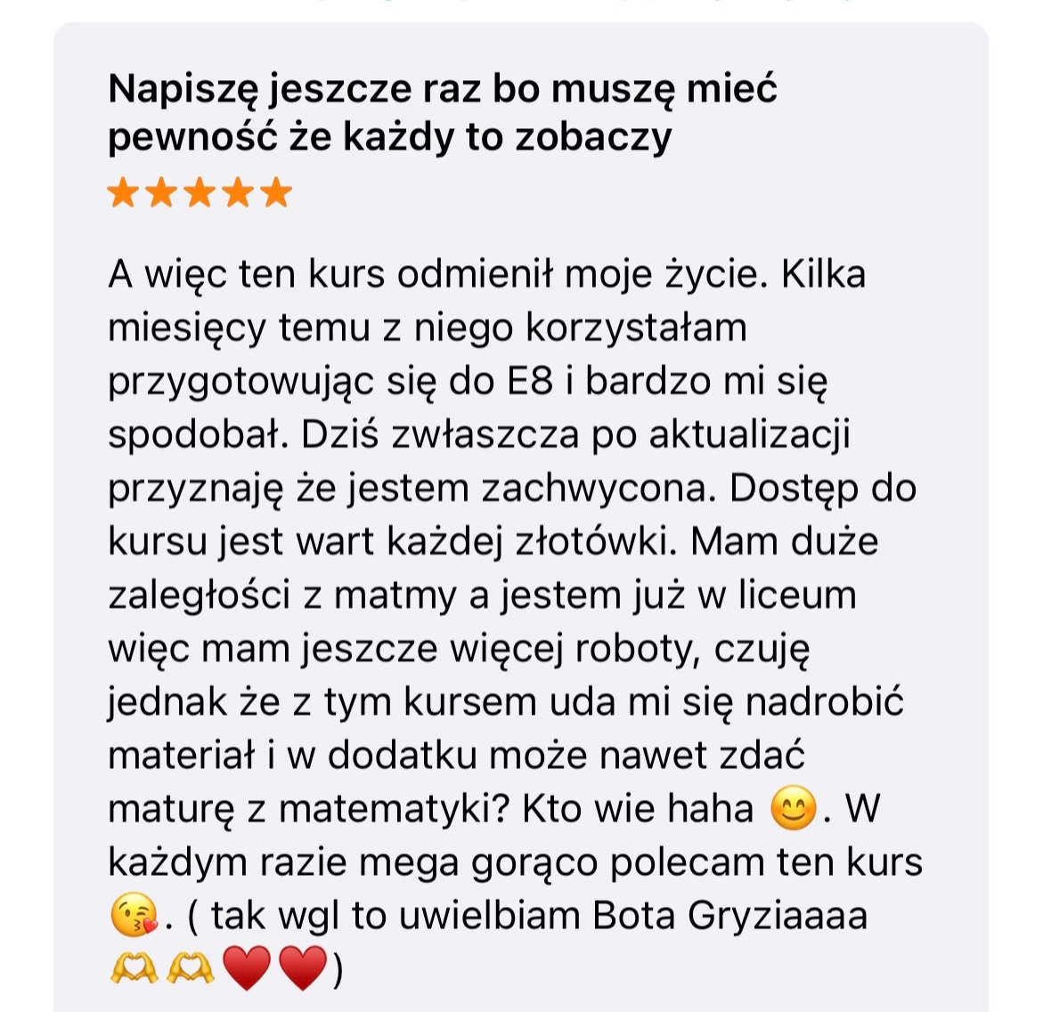 Oczywiście, ponieważ typy zadań na egzaminie 8-klasisty, maturze podstawowej i rozszerzonej są powtarzalne, a my pogrupowaliśmy je dla was w działy powtarzających się typów zadań. Do każdego nagrane są lekcje wprowadzające oraz zebrane są typy zadań w powtarzające się działy - dzięki temu można się ich szybko nauczyć. Podręczniki niestety są przepełnione wiedzą, która nie pojawia się na maturze czy egzaminie dlatego nauka z podręczników jest trudna. Wydaje się, że materiału jest dużo, ale tak naprawdę wcale tak dużo go nie ma. 😊