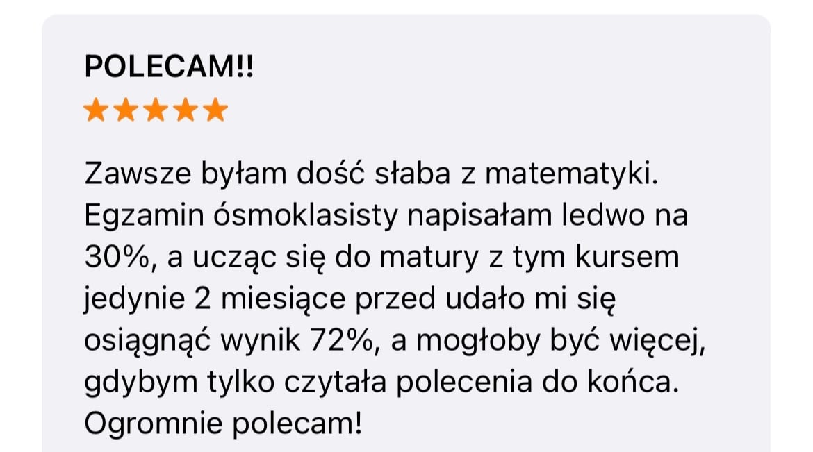 Jeśli naprawdę chcesz uczyć się z tym kursem, ale decyzja zależy od rodziców to przedstaw im konkretne, logiczne argumenty: Oszczędność:. Kurs kosztuje mniej niż 2 miesiące korepetycji. Jest to jednorazowy wydatek na cały rok(możliwe raty 0%). W ten sposób zaoszczędzicie w domu nawet kilka tysięcy. Zero ryzyka: Oferujemy 14-dniową gwarancję zwrotu pieniędzy. Jeśli kurs Ci się nie spodoba, odzyskacie całą kwotę. Jakość: Uczysz się bezpośrednio od korepetytorki z wieloletnim doświadczeniem. To Twoja najlepsza szansa na wysoki wynik. Wsparcie: Masz codzienny kontakt z autorką kursu, dostajesz zarówno dostęp do społeczności uczniów jak i również dostęp do Asystenta Nauczania AI.