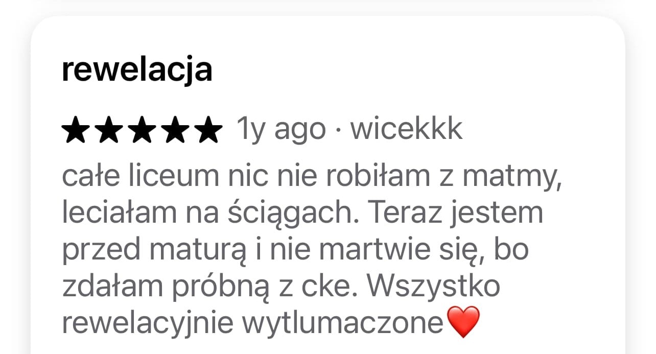 Tysiące uczniów udowodniło, że moja metoda działa. Teraz Ty możesz szybko ogarnąć cały materiał i zdobyć wynik, który otworzy Ci kolejne drzwi na drodze edukacji.