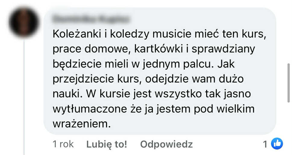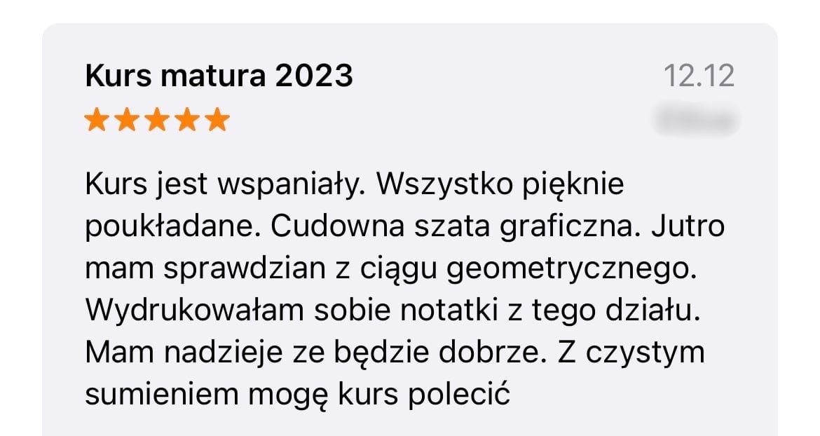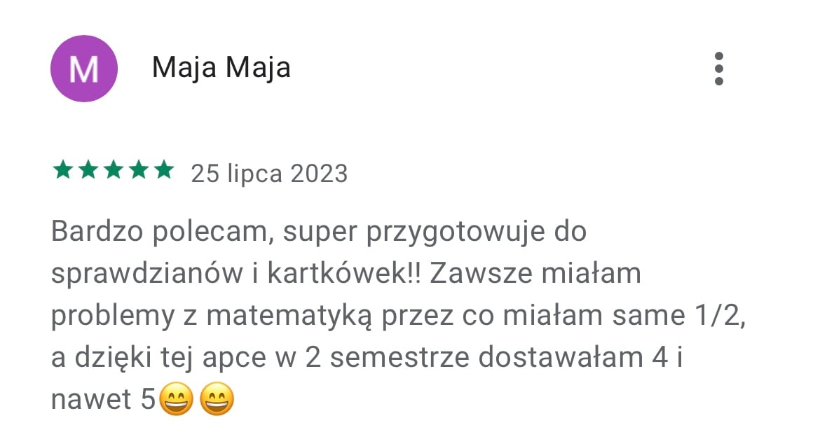 Naszym marzeniem było stworzenie kursu w 100% zastępującego korepetycje. Sądząc po opiniach udało nam się to z czego bardzo się cieszymy 🌞. Mamy ponad 800 pozytywnych opinii kursantów w App Store i ponad 800 pozytywnych opinii kursantów w Google Play oraz na Facebooku. Zachęcamy do ich przeczytania i dołączenia do grona naszych zadowolonych uczniów. 🤩