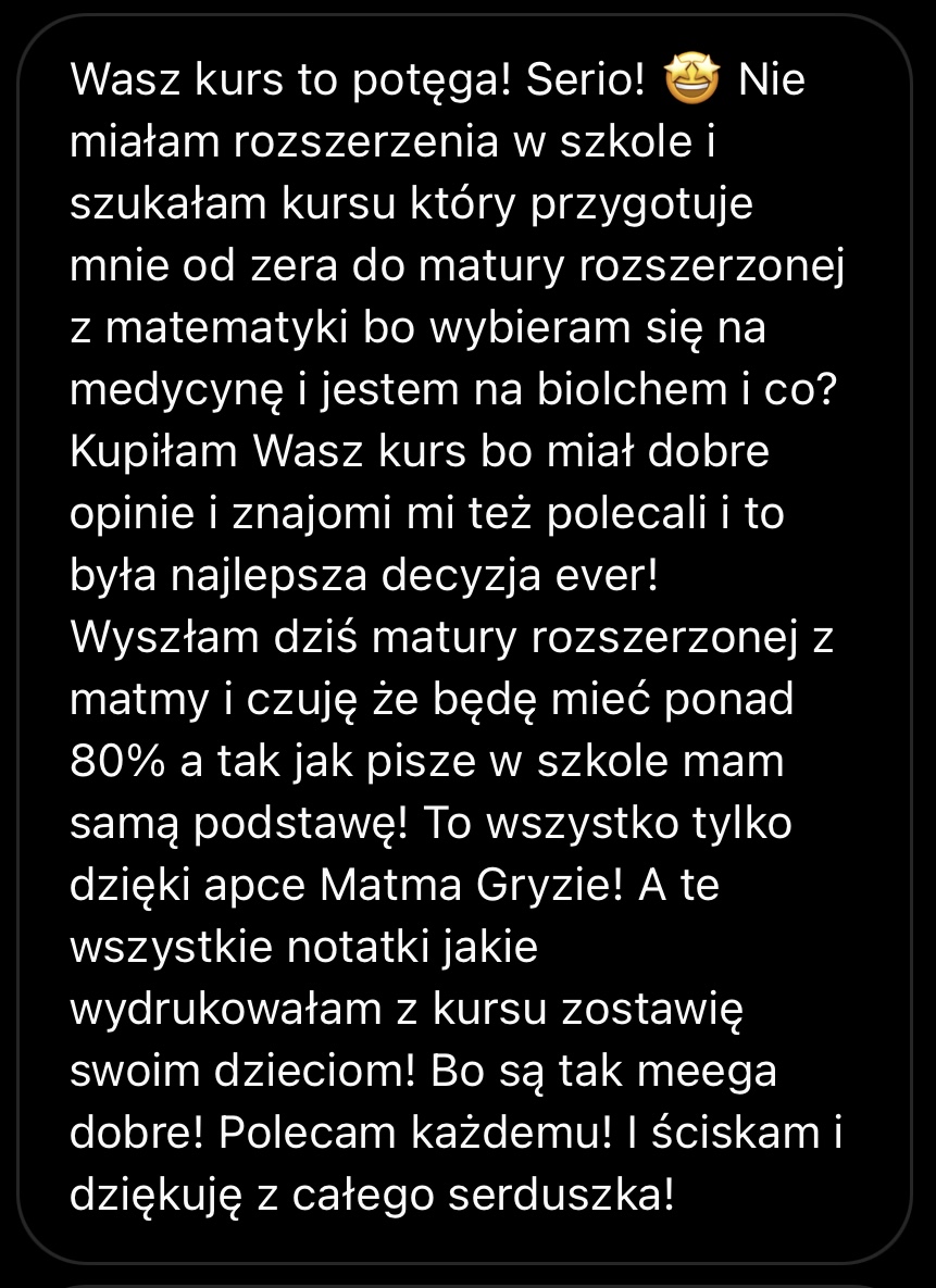 Tak! 🤩 Nasz kurs jest przygotowany tak aby uczył zupełnie od zera! Najpierw mamy wprowadzenie stanowiące przeskok między podstawą a rozszerzeniem. Następnie przechodzimy do nauki działami. W każdym dziale mamy kilkadziesiąt wideolekcji wprowadzających od zera podzielonych na dziesięciominutowe lekcje oraz notatki do druku. Następnie mamy zadania z poprzednich lat z wytłumaczeniem filmowym krok po kroku, gdyż zadania na maturze są powtarzalne. Poukładane są one od najprostszych do najtrudniejszych tak aby było Wam się łatwiej uczyć. Następnie po solidnej nauce działami przechodzimy do bezproblemowego rozwiązywania arkuszy. Każde zadanie posiada filmowe wytłumaczenie. Wiele osób uczyło się z nami od zera do matury rozszerzonej i zdało matury na wymarzony wynik! Możecie przeczytać ponad 1600 opinii tych osób w App Store i Google Play. Zapraszamy do wspólnej nauki! Dołącz do nas już dziś! 😍